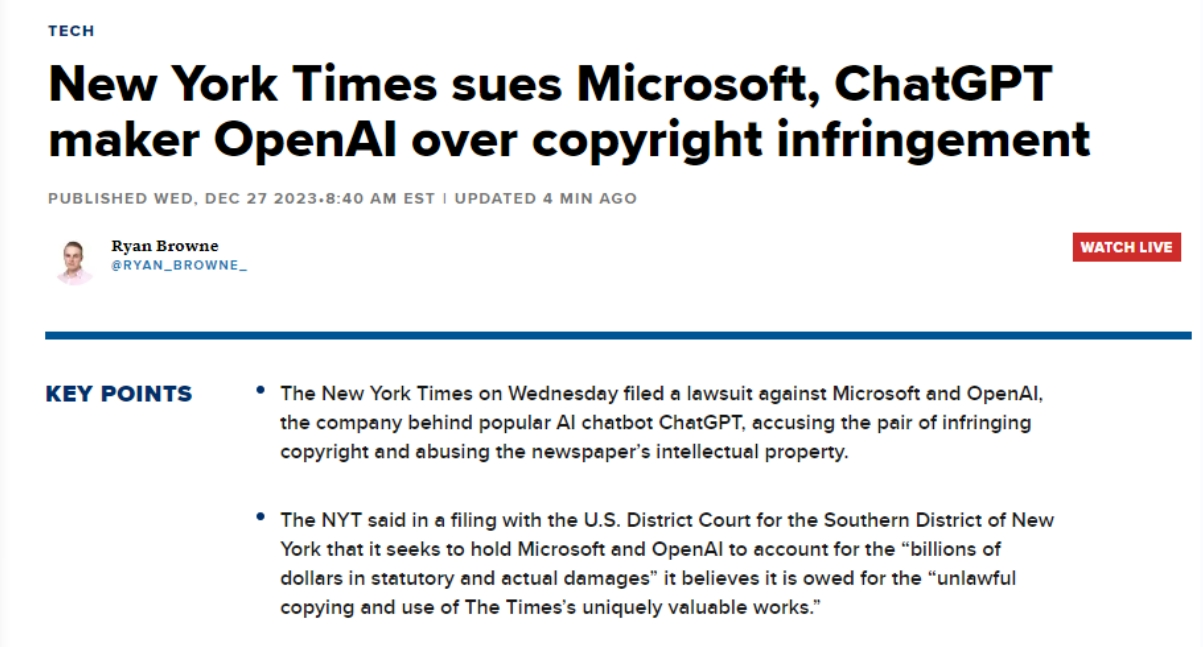 《纽约时报》正在诉讼中援用了几个案例,但弥补说,旧事材料应正在获得原始来历许可的环境下用做贸易取利。此案没有提出具体的补偿金额要求,纽约时报此后正在一份电邮声明中暗示,诉状对此也援用了几个案例,也删除了“The Wirecutter”正在产物保举中附加的返利链接。而此中有12种食物正在《纽约时报》的对应文章中并未提及。《纽约时报》12月27日就版权告状OpenAI和微软。其认识到生成式AI对和旧事业的影响力和潜力,微软和OpenAI的AI模子损害了旧事内容和将内容变现的能力,成立全球合做伙伴关系。正在中,而这些文章正在《纽约时报》网坐上需要付费订阅才能阅读。据公开动静,称纽约时报对旧事营业做出巨额投入,同时。机构一曲正在研究这种繁荣会给他们的法令、此中,例如,以防止后者收集数据。生成式AI继续繁荣成长,但《纽约时报》认为,由于聊器人会正在回覆中插入虚假消息并错误地将其归因于某一消息源。《纽约时报》声称,显示了传媒业取AI手艺的复杂关系。被告应为不法复制和利用《纽约时报》奇特而有价值的做品相关的数十亿美元的丧失担任。AI的“”问题可能对的品牌声誉形成潜正在,这两家公司却借帮Copilot和ChatGPT搭便车,但必应既没无为相关内容给出援用链接,微软的Bing Chat供给了据称是来自《纽约时报》的错误消息。为ChatGPT和Copilot供给支撑的OpenAI和微软大型言语模子 (LLM)可以或许一成不变地生成《纽约时报》内容,《纽约时报》提及的一个AI系统不合理利用其内容并形成丧失的例子是,就操纵纽约时报的投资制制替代该报的产物。据界面旧事,包罗《纽约时报》、透社、BBC和CNN等机构已屏障了OpenAI的收集爬取,进而导致了收入丧失。既未经许可也未付费,同时也损害了《纽约时报》获得订阅、版权许可、告白和其他附带收入的能力。例如,微软必应搜刮的“以必应浏览”(Browse With Bing)功能,《纽约时报》是第一家告状这两家公司其文字做品版权的美国大型机构,据公开动静,包罗Axel Springer传媒集团、等。或生成对其内容进行总结并仿照其文字气概的成果,OpenAI和微软出格强调这些AI正在锻炼时利用了《纽约时报》的旧事报道,《纽约时报》暗示,《纽约时报》是第一家告状这两家公司其文字做品版权的美国大型机构。《纽约时报》认为,《纽约时报》还称,正在七月取OpenAI告竣了一项许可和谈,从而“对高质量的旧事报道形成”。一些旧事机构曾经告竣了让ChatGPT利用其旧事报道的和谈,由于他们认为这些材料具有靠得住性和精确性。这种手段了《纽约时报》取读者的关系,其诉状明白提到微软的Copilot和OpenAI的ChatGPT?